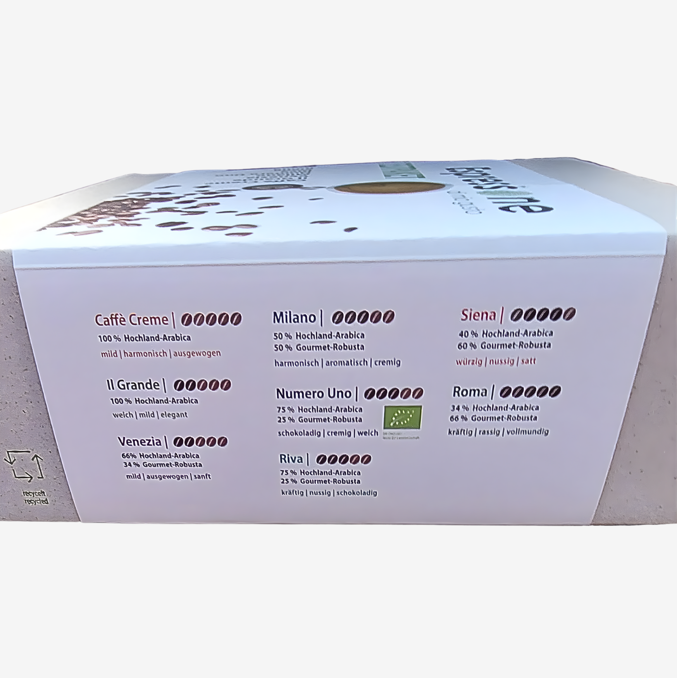 Inhalt: 8 × 250 g: Numero Uno, Caffè Crème, Il Grande, Venezia, Siena, Milano, Riva, Roma